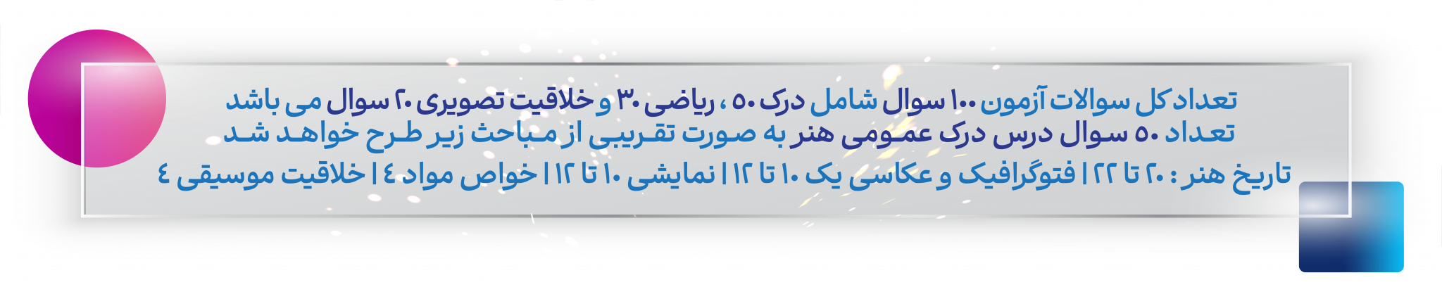 درک عمومی هنر : تاریخ هنر : احمد رستمعلی خلاقیت نمایشی : افسانه نسل شریف خواص مواد : مریم افسری خلاقیت تصویری و فتوگرافیک : آتوسا خلج - ریحانه جالو موسیقی : پرند رضایی - مهتا علیمیان درک عمومی ریاضی و فیزیک : رحمت مشیدی - دانیال قزوینیان